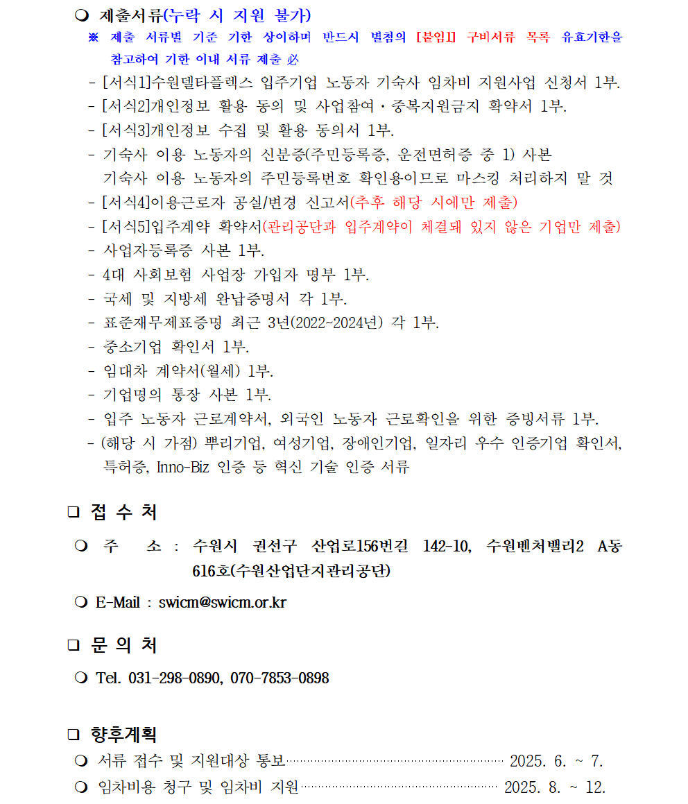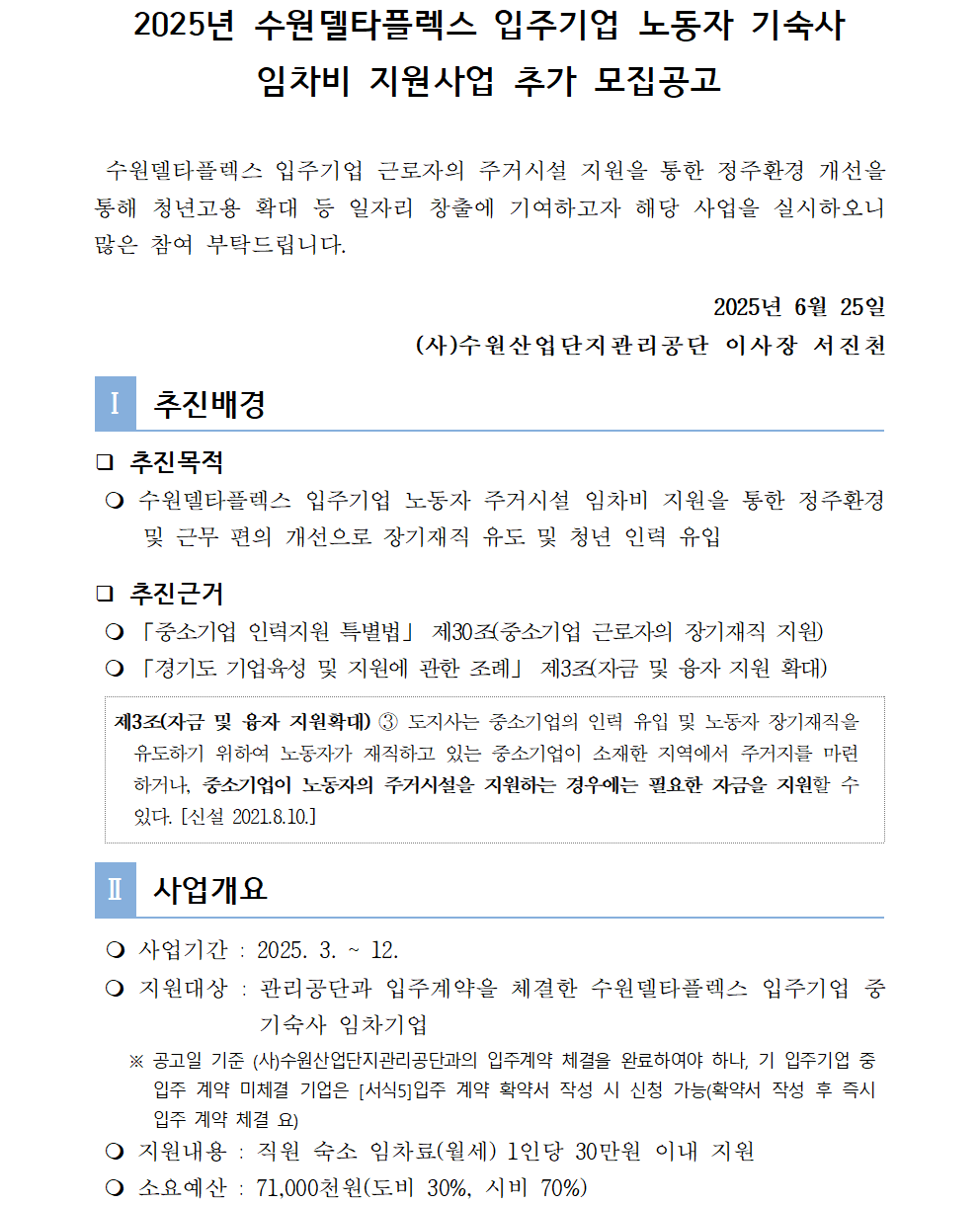 2025년 수원델타플렉스 입주기업 노동자 기숙사 임차료 지원사업 추가 모집 안내