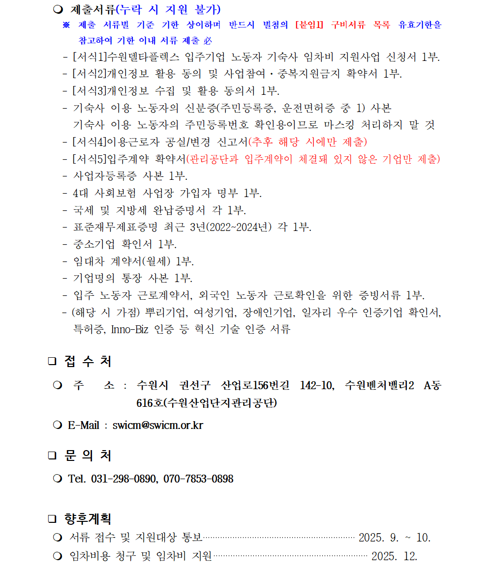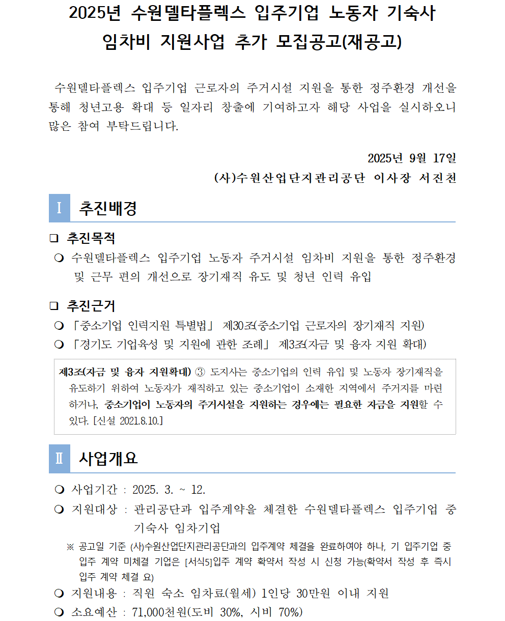2025년 수원델타플렉스 입주기업 노동자 기숙사 임차료 지원사업 추가 모집 안내(재공고)