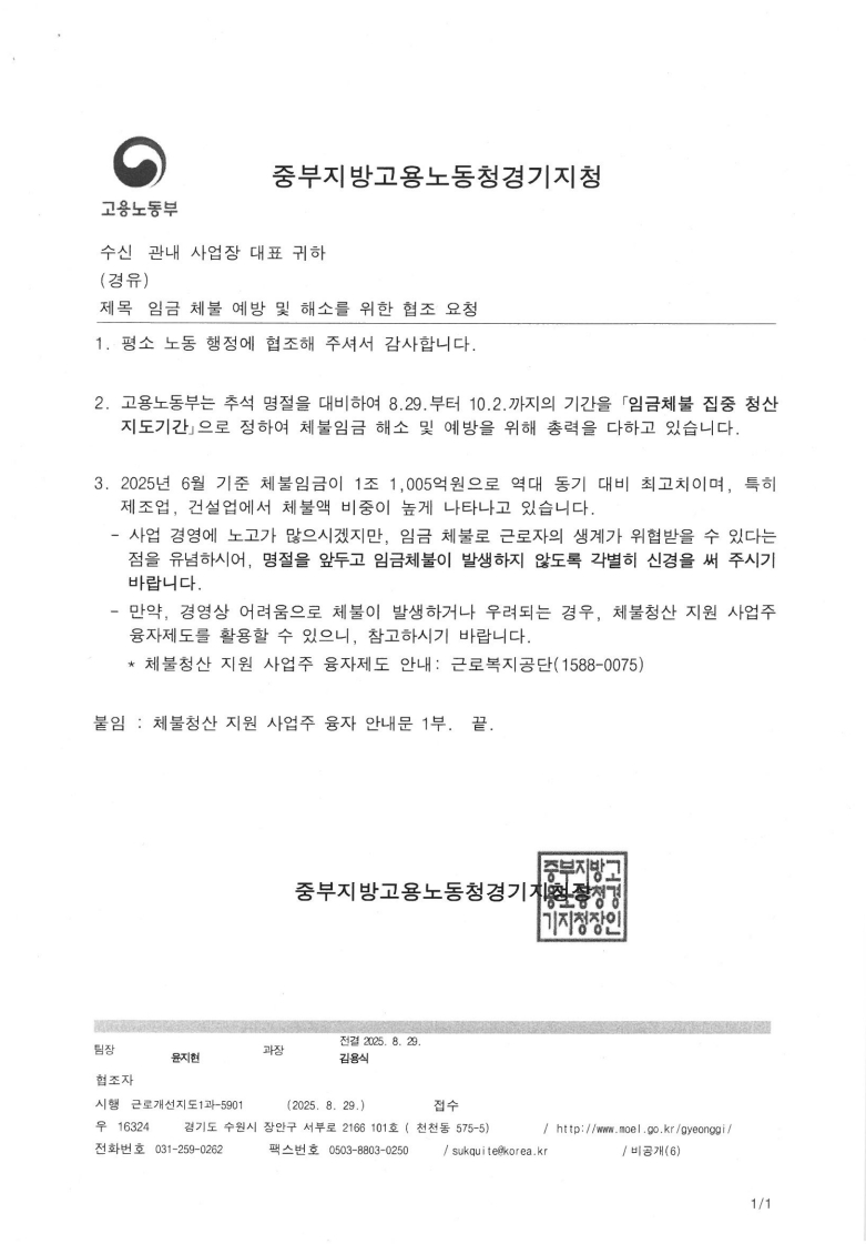 [고용노동부] 임금 체불 예방 및 해소를 위한 협조 요청