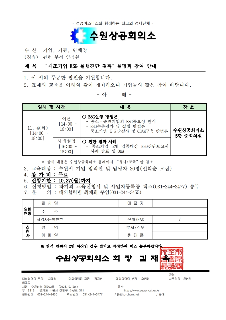 [수원상공회의소] '제조기업 ESG 실행진단 결과' 설명회 참여 안내