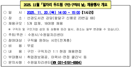 취업에 어려움을 겪는 구직자와 인재 채용을 희망하는 기업을 대상으로 「2025. 11월 일자리두드림 구인 · 구직의 날」 채용행사를 아래와 같이 개최하오니, 참여를 희망하는 기업 또는 기관에서는 붙임 신청서를 작성하여 2025. 11. 11.(화)까지 수원일자리센터로 (FAX. 031-369-2776) 제출하여 주시고, 유선(☎ 031-5191-6884)으로 연락하여 주시기 바랍니다.
