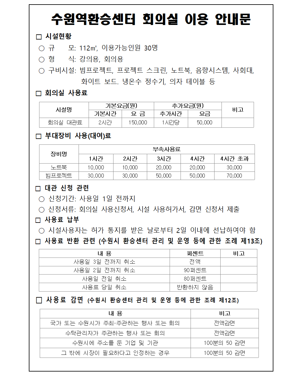 수원역환승센터 내 회의실 공간이 마련되어 아래와 같이 안내 드리오니 수원산업단지 관리공단 내 업체의 회의 토론회 워크숍 등 회의 공간 필요시 많은 이용 부탁드리겠습니다.