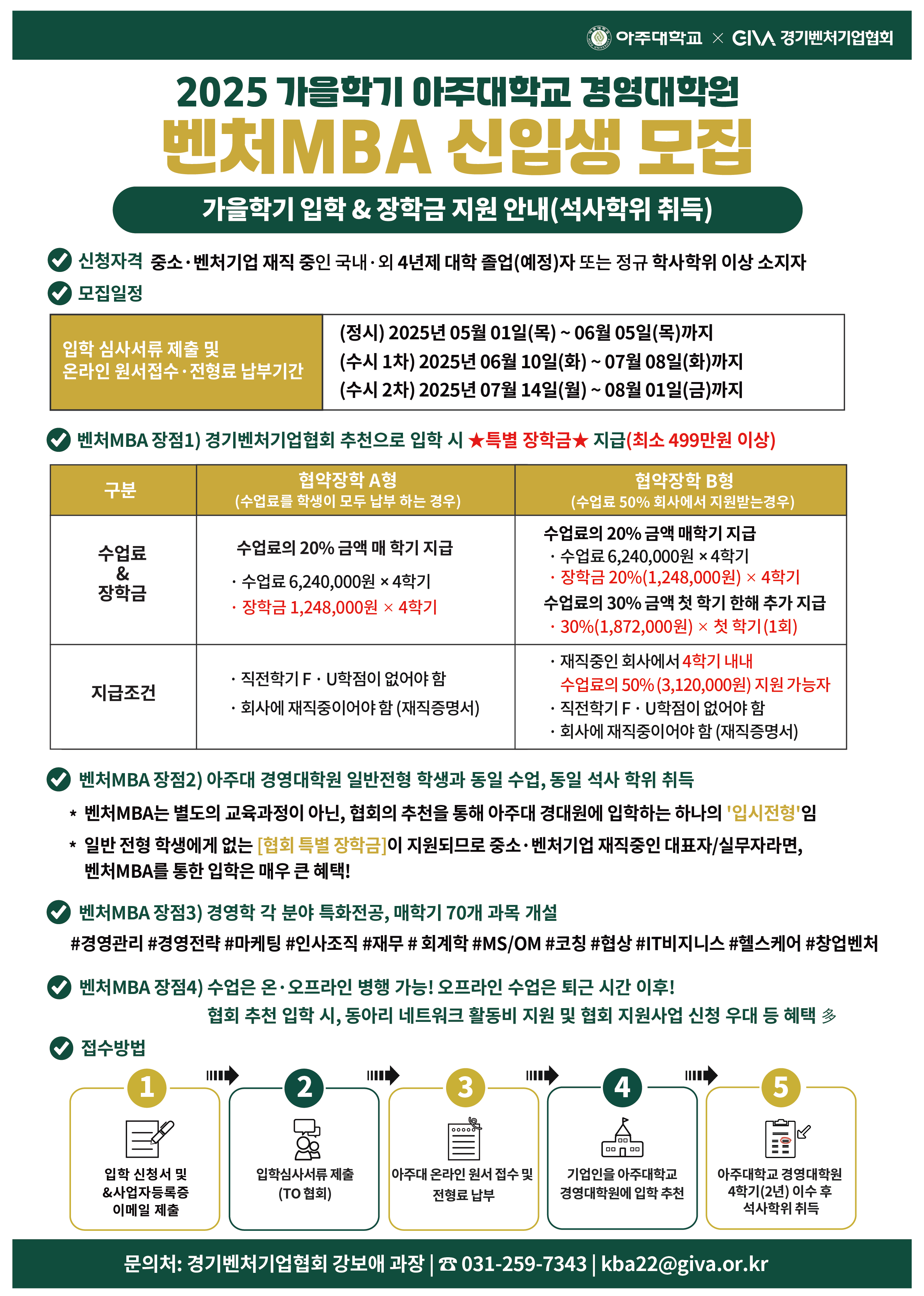 입학을 추천하고 매 학기 경기벤처 협약 장학금을 지원하고 있습니다. 아래와 같이 『2025학년도 가을학기 아주대학교 경영대학원 벤처MBA 신입생 모집』 입시 일정