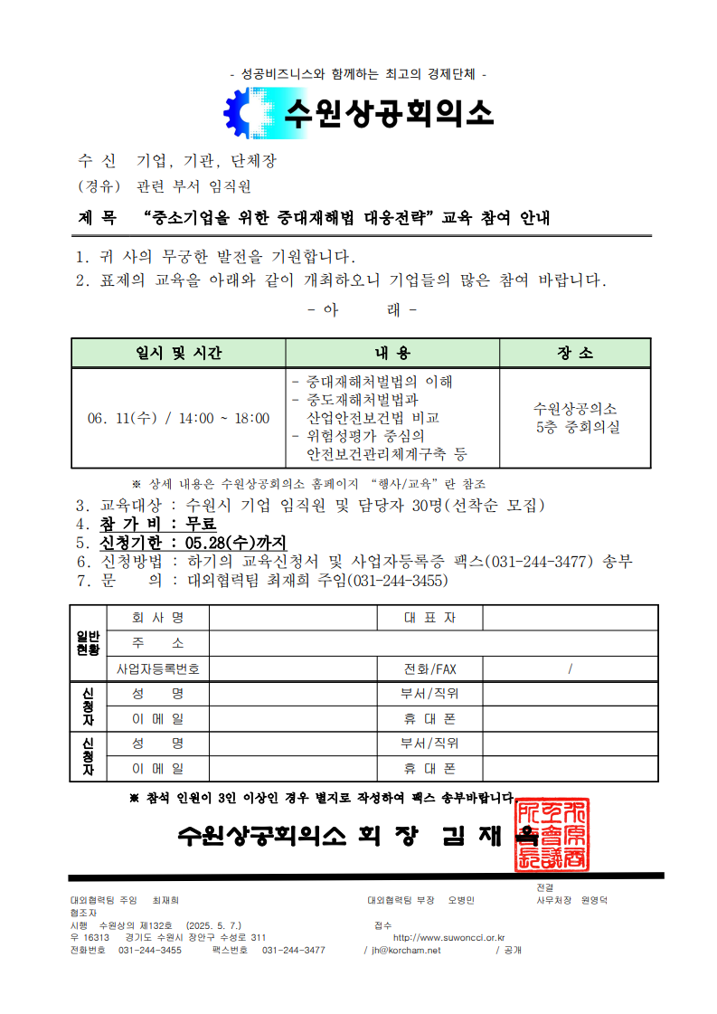 수원상공회의소에서는 아래와 같이 중소기업을 위한 중대재해법 대응전략 교육을 개최하오니, 입주 기업들의 많은 관심바라며 별첨 파일을 작성하시어 팩스(031-244-3477)로 제출 바랍니다.