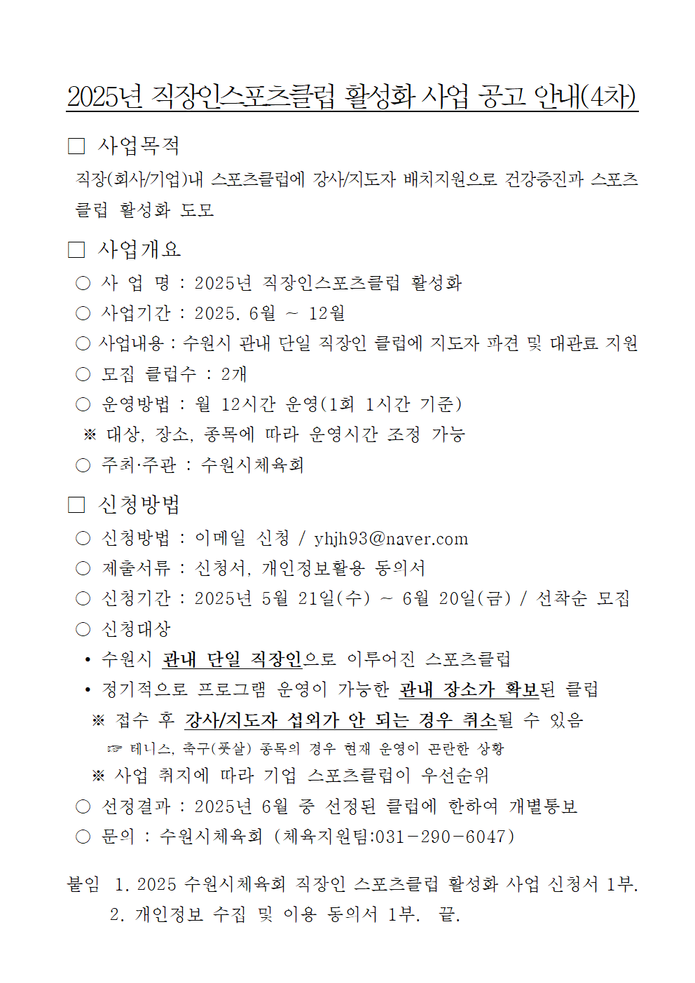 [수원시체육회] 2025 직장인스포츠클럽 활성화 사업 안내