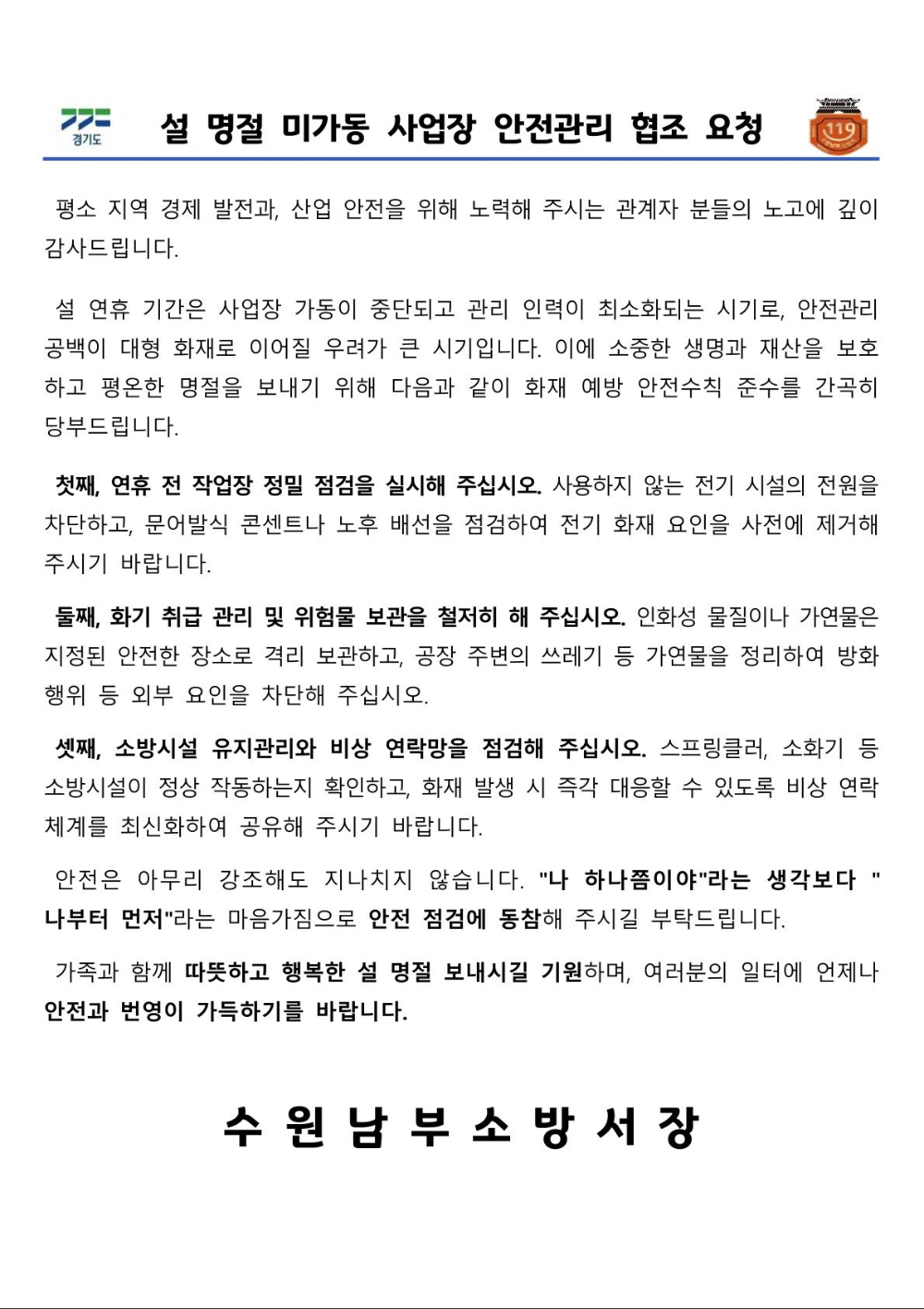 [수원남부소방서]설 명절 공장‘ 안전관리 당부제’운영 안내