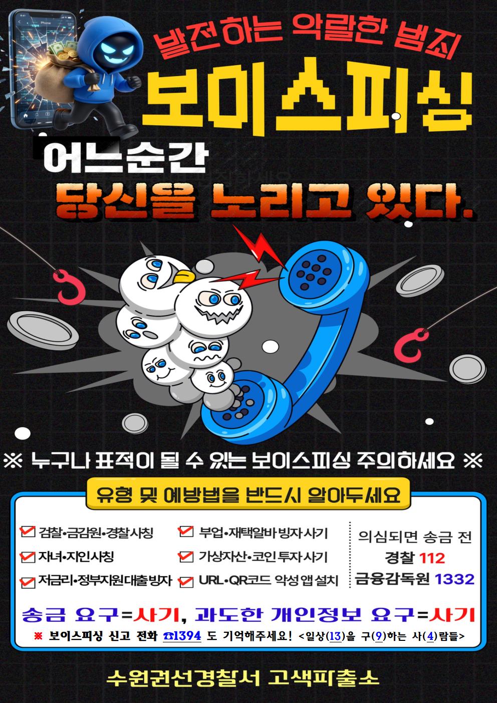 최근 델타플렉스 내에서 보이스피싱 범죄가 지속적으로 발생하고 있어, 관할 파출소의 협조 요청에 따라 관련 예방 포스터를 게시합니다.